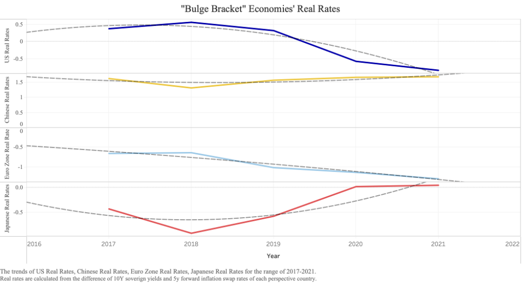 To unpack this, when looking at the developed basket’s real rates (Figure 1), we can see that all of the top 4 economies are ranging close to the 0% mark, and in the case of the US and the Euro-Zone, we can see negative real rates. With China and Japan, we can see real rates remaining rangebound right above the 0% mark. The real question is, will these trends perpetuate?