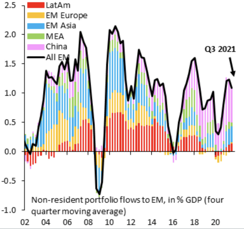 This shows that EM portfolio flows outside of China have been non-existent, signaling an illiquidity crisis going forward for emerging markets excluding China. Despite emerging markets offering higher relative yields than “bulge bracket” safe haven nations, tighter aggregate financial conditions may reduce the already drying up liquidity from the EM basket. 2022 will certainly not be the best year for EMs as a whole (Debt, Equities,FX).