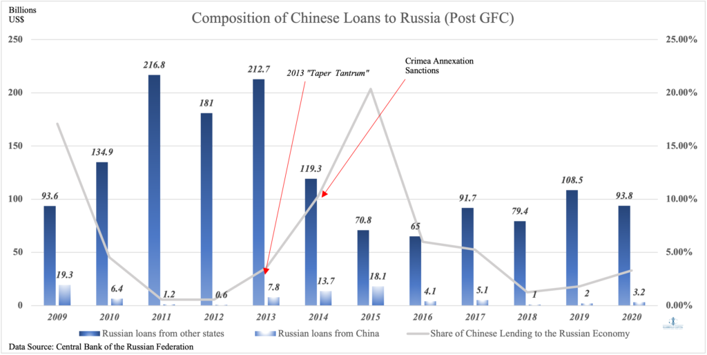 China has also, reluctantly, been a pseudo-strong supporter to the Russian financial sector. As per the OSW Beijing-Moscow Axis Report,”Financial cooperation, including Chinese loans and direct investments in Russia, is generally limited and confined to selected sectors of the economy. The way Chinese capital is utilised deepens the model of centre‐periphery relations, where raw materials from the Russian Federation are exchanged for industrial goods from the PRC. Money flows predominantly towards strategic energy and mining projects carried out by policy banks and state‐owned companies. A more ‘organic’ and commercially‐led inflow of Chinese capital from commercial banks and private investors – a potential alternative to Western funding – has encountered significant barriers: Beijing’s fear of being targeted by Western sanctions, an unfriendly business environment in Russia, and also its reluctance to sell key assets. As a result, Chinese money still has not filled the visible gap left by EU and US investors and lenders in the Russian Federation since 2014.” These dynamics are heavily extrapolated [Figure 5] as it is evident that Chinese liquidity is heavily utilized in risk events affecting Russia’s financial system in terms of inflows. Taking this dynamic into account, we can certainly expect China to do the same for Russia following the most recent western sanctions.