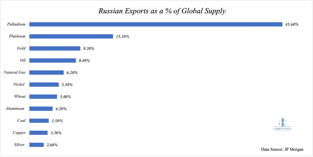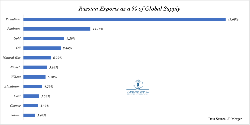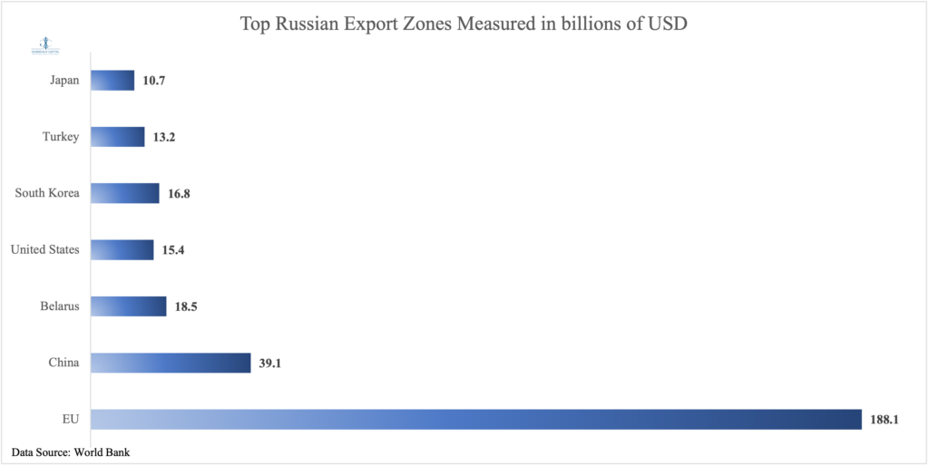 A large question at hand following the sanctions that have been imposed on Russia’s economy is if the economic risk will be felt not only in Russia, but if the effects will felt by its economic partners and adversaries? First we must take a look [Figure 2] at who Russia’s largest trading partners are and what Russia exports to the world in abundance amidst a global goods supply “struggle” [Figure 3]: