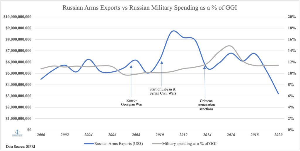Provided the pretext on Russia’s military based advantage, we should take a look at the true value in its economic context: As SIPRI reported,” Russian arms exports in 2016–20 were at a similar level to 2001–2005 and 2006–10 but were 22 per cent lower than in 2011–15, when Russian arms exports peaked. While Russian arms exports in 2016–18 remained at a relatively high level, they fell in both 2019 and 2020. The overall decrease in Russia’s arms exports between 2011–15 and 2016–20 was almost entirely attributable to a 53 per cent drop in its arms exports to India. This decrease was not offset by large increases in Russia’s arms exports to China (49 per cent),” we can note that China has become a “baseline buyer” [as expected] for the Russian arms exports. This has kept Russian defense companies active despite Russian defense military spending as a % of GGI stabilizing (with some [Crimean Annexation + Sanctions] exceptions) between 10-12% (See Figure 4).