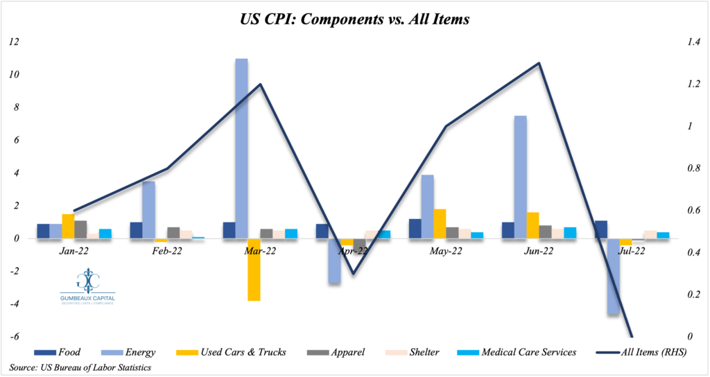 It is highly evident that the Fed has been using its tool-kit to fight inflationary pressures as we saw a 0.3% M/M Core CPI print in July. This is a substantial landmark for a data dependency framework as a 1.4% drop in CPI from June marks as the largest M/M decline since the 1980s. Moreover on the inflation picture, the NFIB relayed that for small market enterprises (SMEs) a net 37% of SMEs plan price hikes, which is down 12 points from June. This is highly indicative of an inflection point in US inflation momentum, but we must keep in consideration the composition of decelerating inflation to grasp a clear macro-picture (see Figure 1).