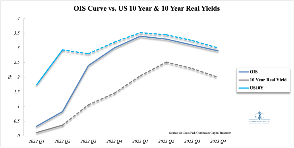 Given that long term growth is going to be dependent on inflows to capital markets to service the debt of today’s (growth-oriented) expenditures, the Fed may undershoot the general hawkish expectations (Figure 3), and take more of a steady (still hawkish) approach to their tightening framework relative to the recent aggressively hawkish tones from Fed affiliates, in aim to promote risk-stability in markets while easing inflationary pressures.