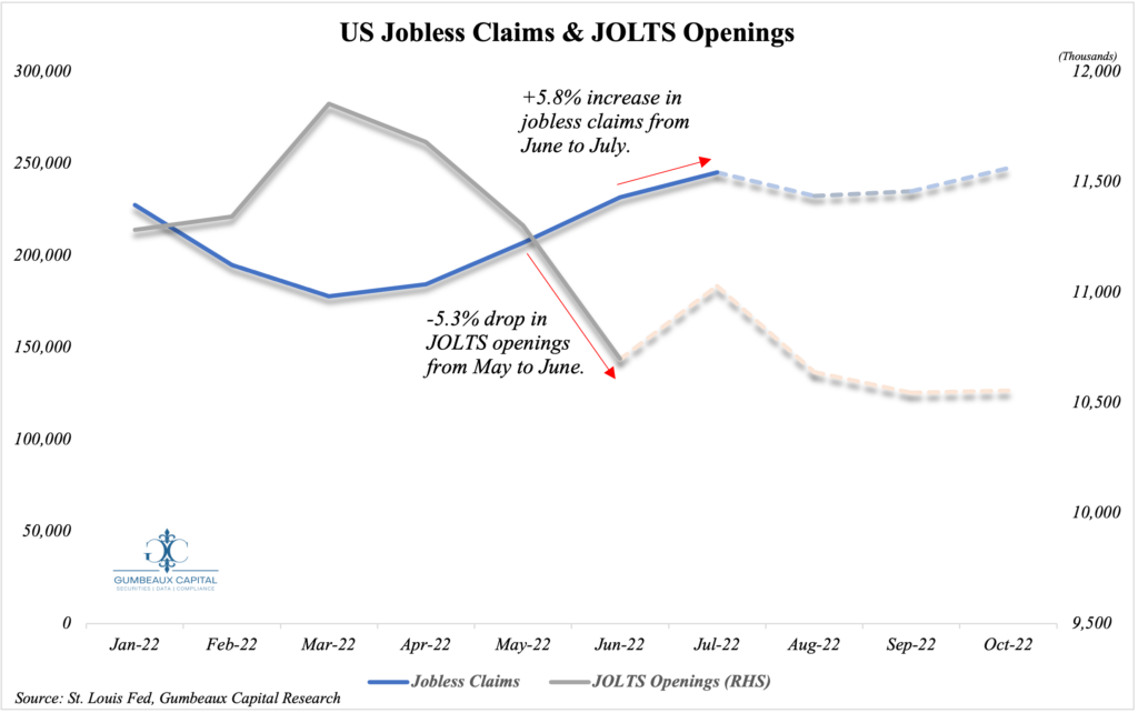 While we saw a red hot NFP data print for the month of July, the jobless claims count has been rising as we see increased levels of layoffs (highly-evident in tech) as cost of capital continues to rise for firms. JOLTS data paints the same picture as we have seen a consistent drop in job openings since February. We project that jobless claims will initially fall in July due to the relatively improved business conditions seen in July, allowing for more job openings, but the picture will continue to extrapolate the macro environment with slightly lower job openings and increased jobless claims; especially as the labor-force-participation-rate remains below pre-pandemic levels.